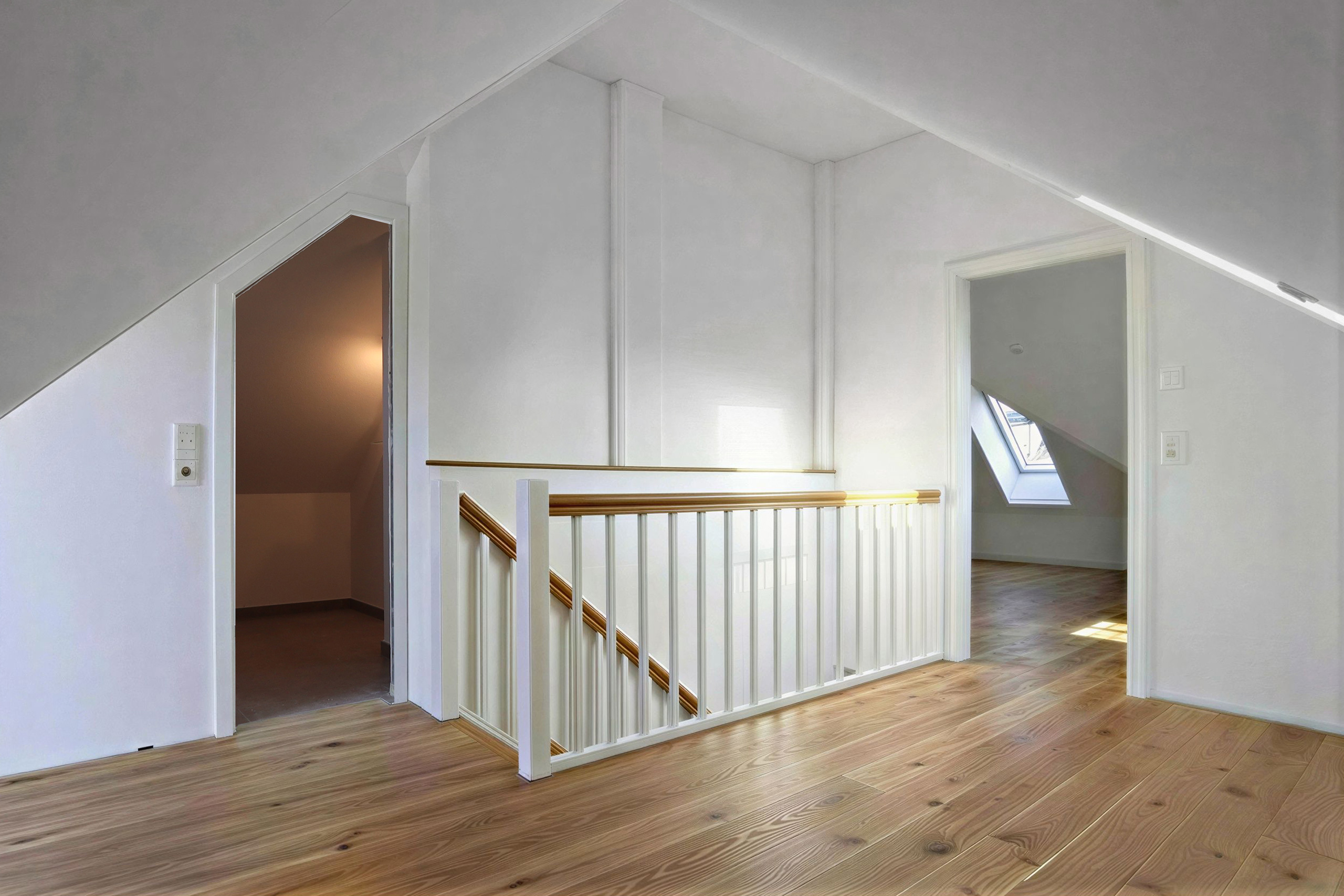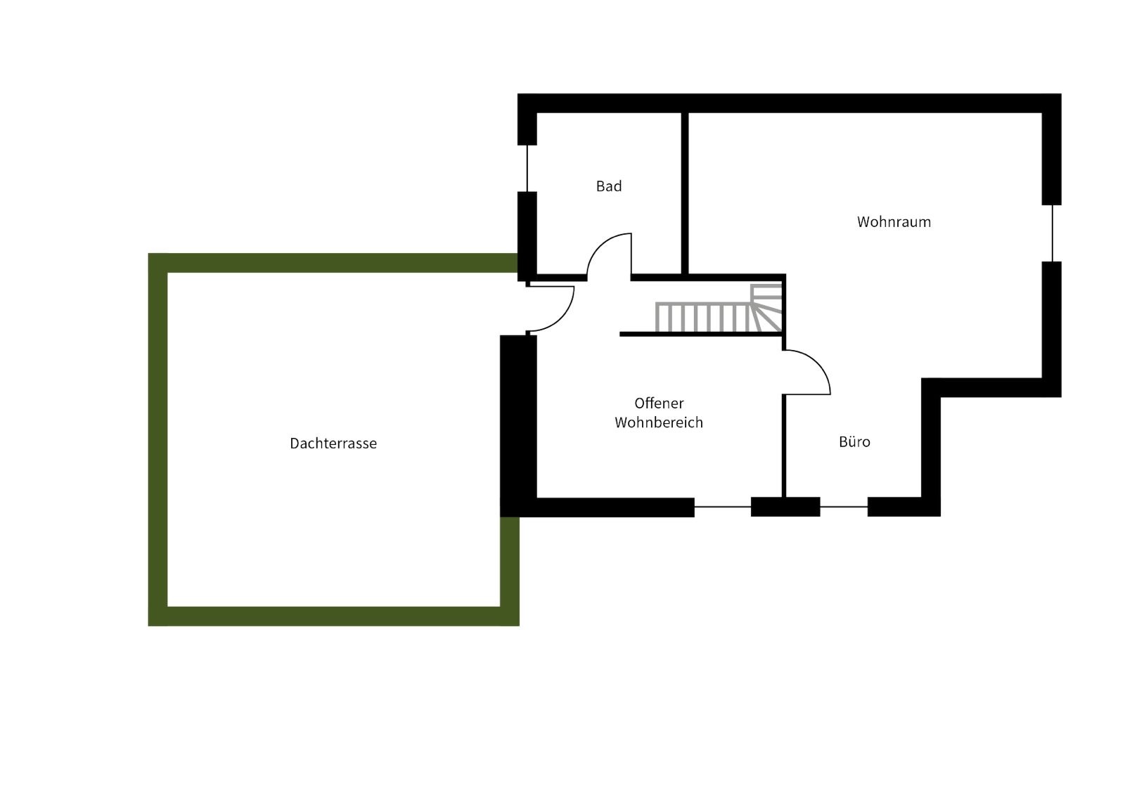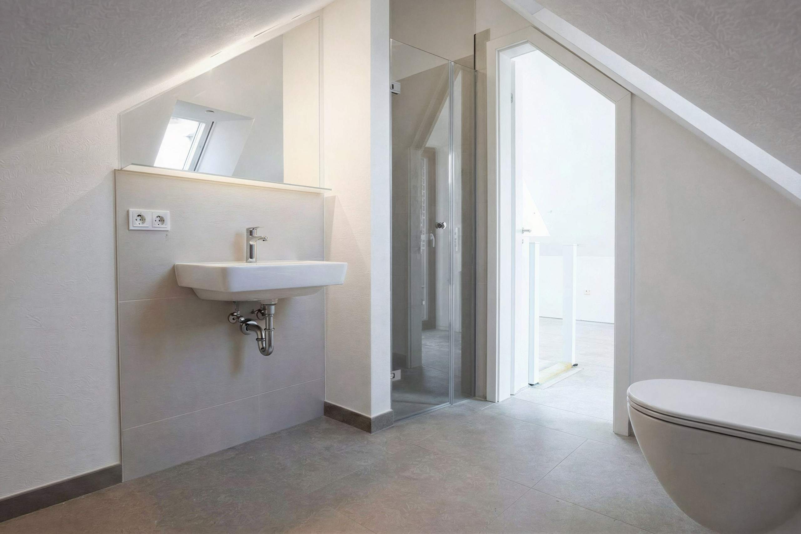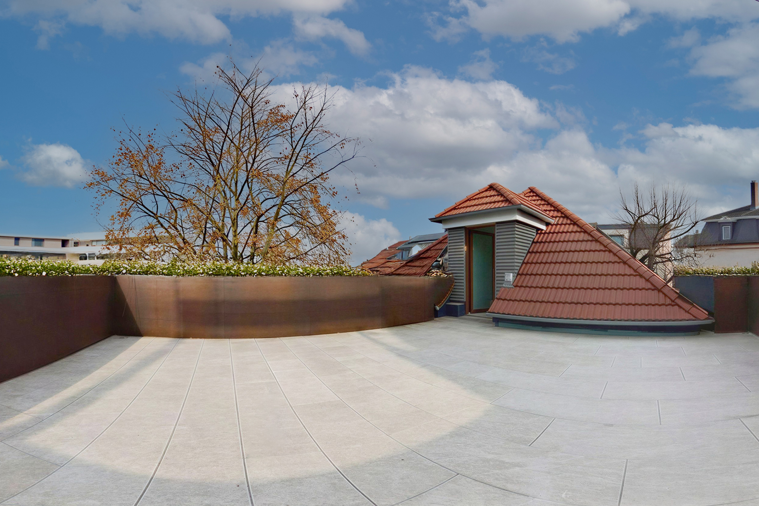 Das Dachgeschoss bildet einen eigenständigen Rückzugsbereich mit zusätzlichem Wohn-/Bürobereich, Duschbad und direktem Zugang zur ca. 38 m² großen Dachterrasse (50 % angerechnet). Hier entsteht eine private Außenfläche mit Weitblick – ruhig, geschützt und vielseitig nutzbar.