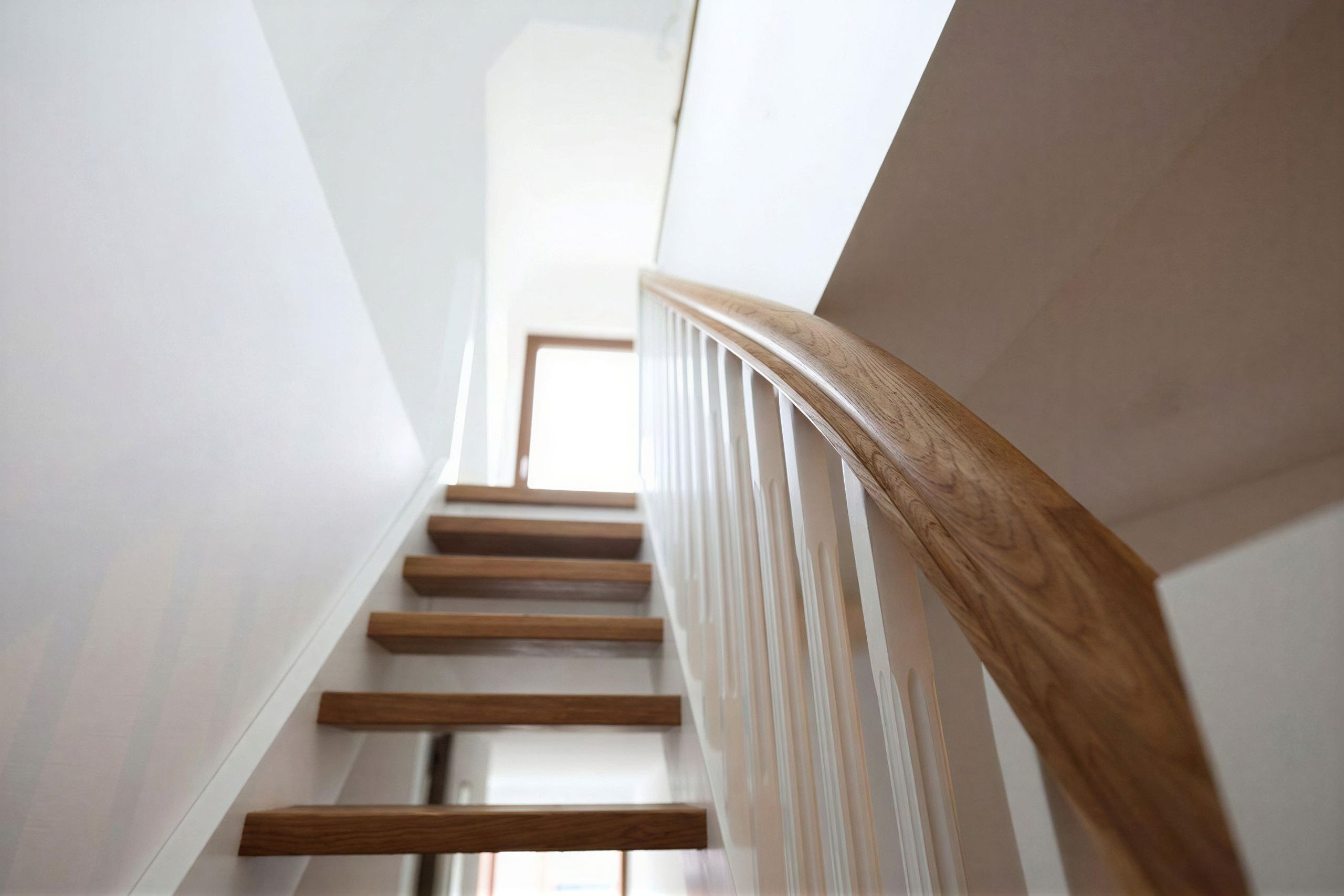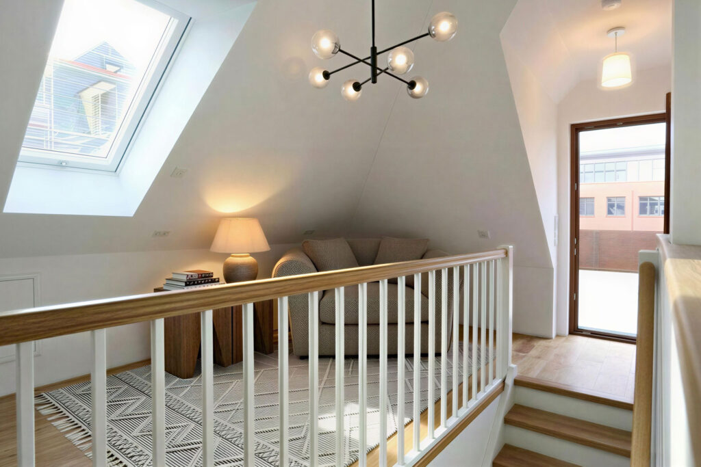 Herzstück der Wohnung ist der offen gestaltete Wohn-, Ess- und Kochbereich mit ca. 41 m² im Obergeschoss. Großzügige Fensterflächen sorgen für viel Tageslicht und öffnen sich zum Balkon. Ergänzt wird die Ebene durch ein Schlafzimmer, ein Kinderzimmer, ein Büro, ein Bad, ein Gäste-WC sowie einen Abstellraum.